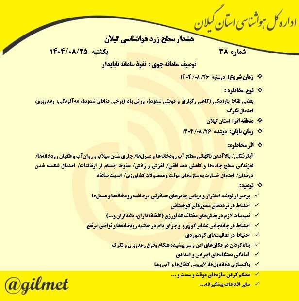 مدیرکل هواشناسی گیلان گفت: طی دوشنبه و مطابق هشدار سطح زرد صادر شده، شرایط برای افزایش ابر و بارندگی و وزش باد و رعد و برق و تگرگ فراهم می شود.