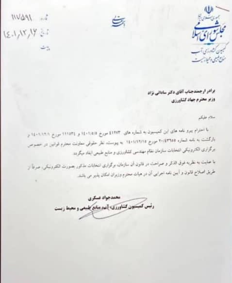 ۱.مطرح گردید که هیات مدیره فعلی سازمان با انتخابات الکترونیکی در گیلان مخالف بوده اند در صورتی که طی نامه شماره ۱۱۷۵۹ مورخ ۱۴۰۱/۱۲/۱۶ از مجلس شورای اسلامی به وزیر جهاد کشاورزی نطر کمیسیون کشاورزی در ارتباط با برگزار انتخابات الکترونیک به شرح ذیل اعلام گردید: